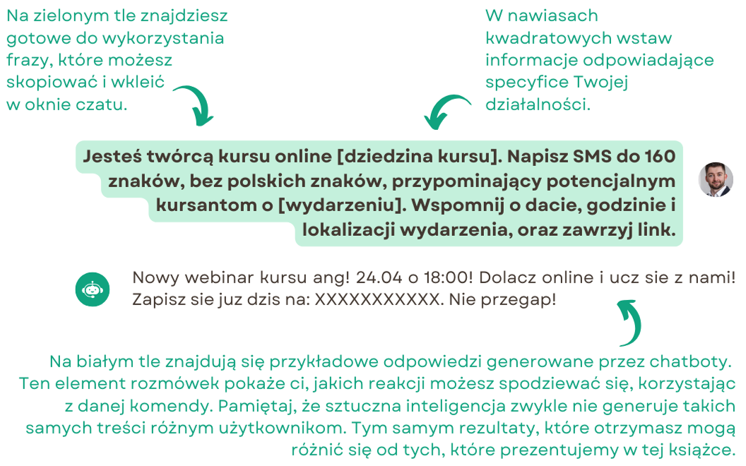 - Książka z gotowymi frazami, które możesz skopiować, wkleić i natychmiast użyć w chatbocie.